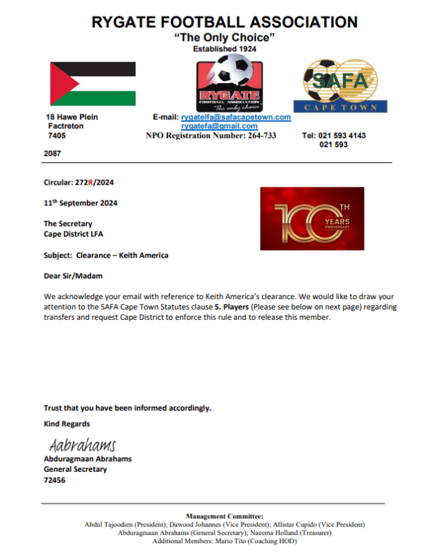 In fact, Tajoodien, also the president of the Rygate LFA, has already followed the due processes when he wrote a letter to the Cape District Football Association (CDFA) requesting that the Santos chairman handover the player’s clearance.