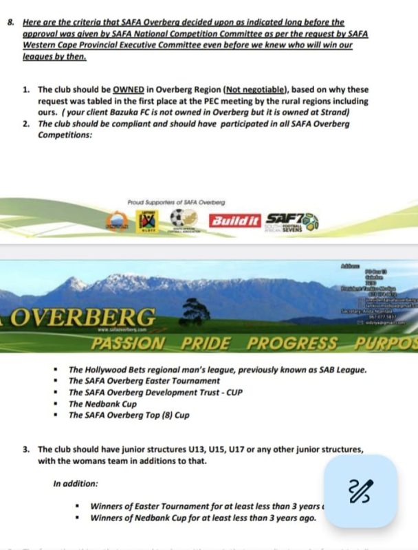 “When the proposal was given the thumbs up to be sent to the Competition Committee on national level there were already set criteria. That was not even before the playoffs. We didn’t even know who was going to win the league in the Overberg. Now, fast forward to the emergency meeting that we had with the Competition Committee. The criteria were then reiterated to the clubs to say first of all the clubs should be owned in the Overberg,” Modipa further explained.
