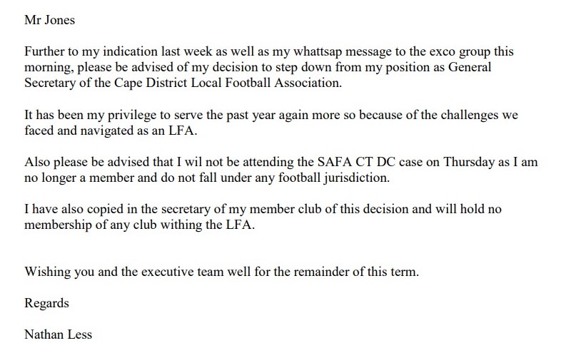 Less sent a letter of apology to the region stating that he resigned from all football but the case was heard in absentia.