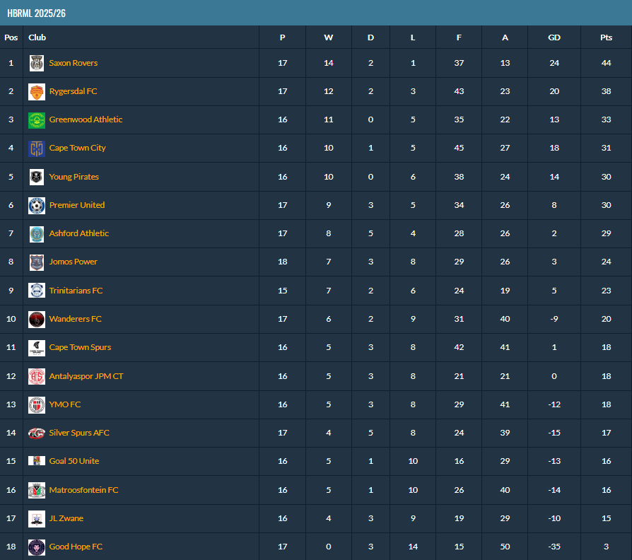 In fact, Saxons’ (44 points) defeat has now opened things even more and reduced their lead at the top of log over second placed Rygers (38) from nine to six points while Greenwood (33), who occupies the third position, can also still close the gap on Rygersdal should they win their game in hand.