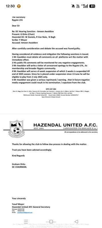 Hazendal also requested that the LFA respect their process and not intervene. But then he transgressed again by continuing to bring the LFA into disrepute – and then the LFA charged him. And guess what? He failed to appear for the disciplinary enquiry.